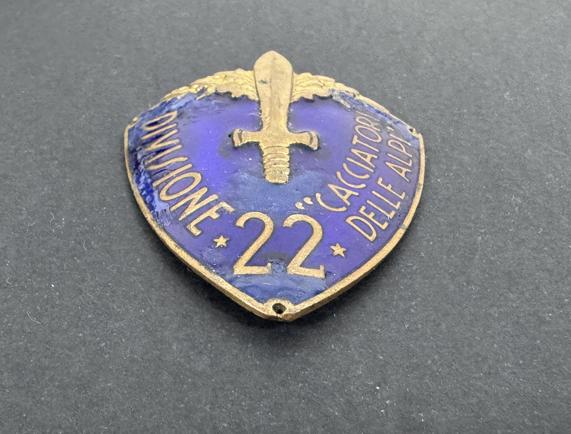 An original and rare officer's shield arm badge of the 22nd Division - Hunters of the Alps (Scudetto da braccio 22°divisione Cacciatori Delle Alpi).
