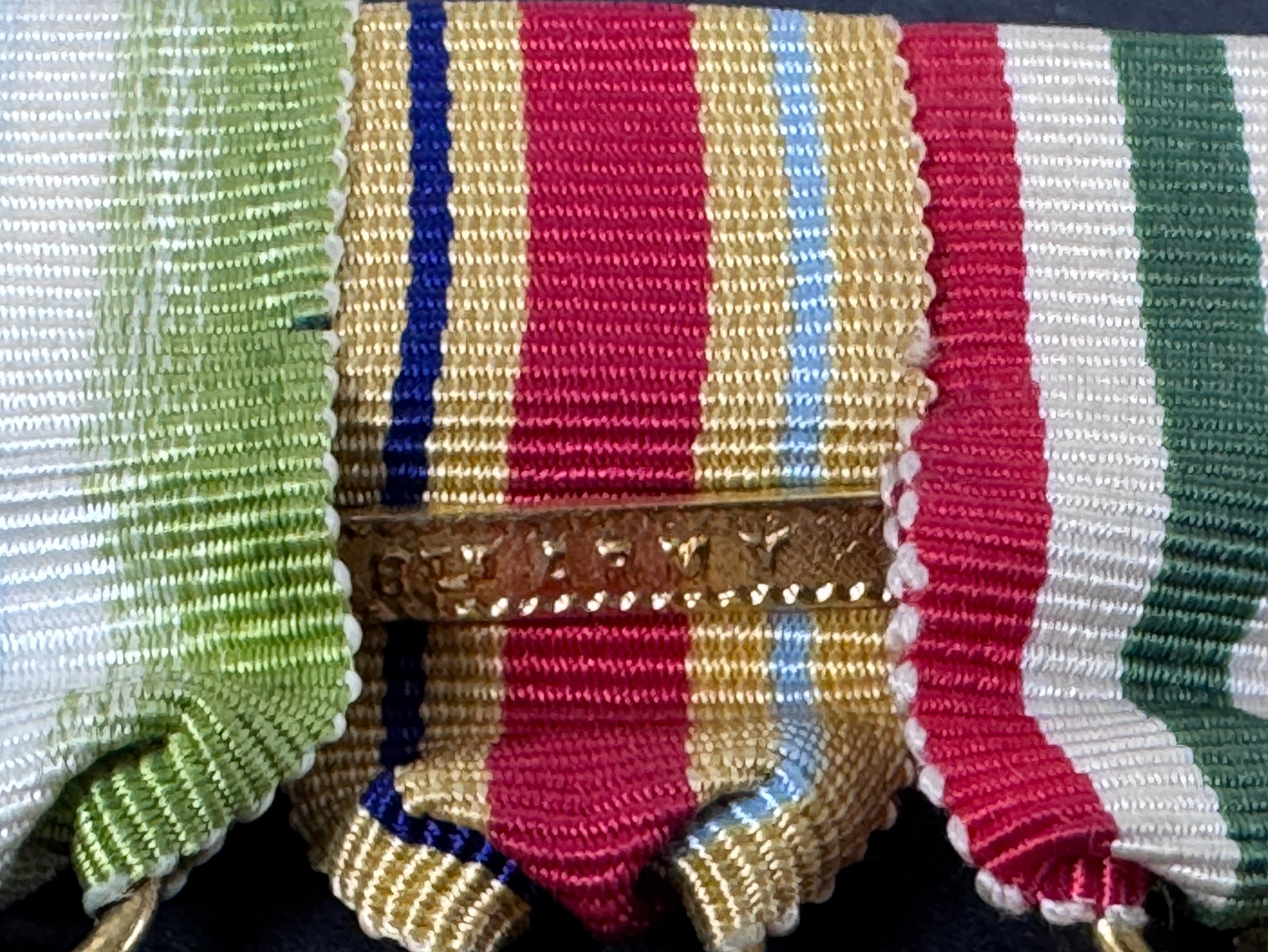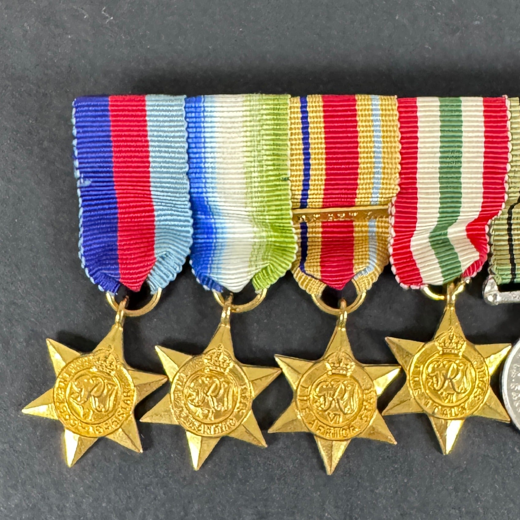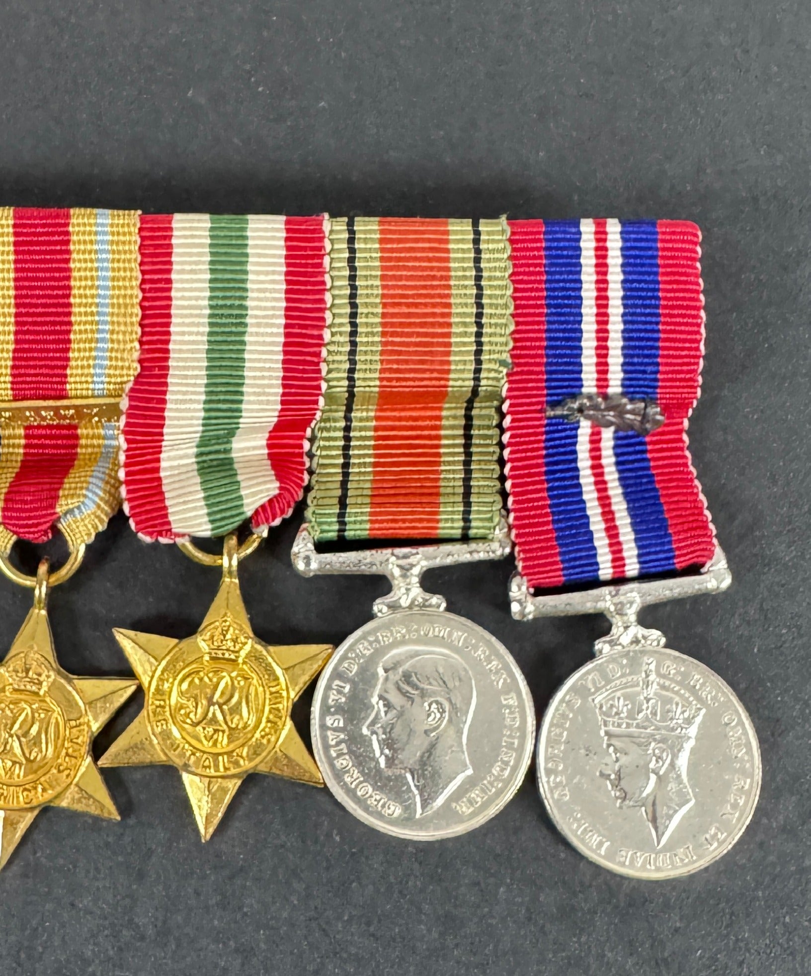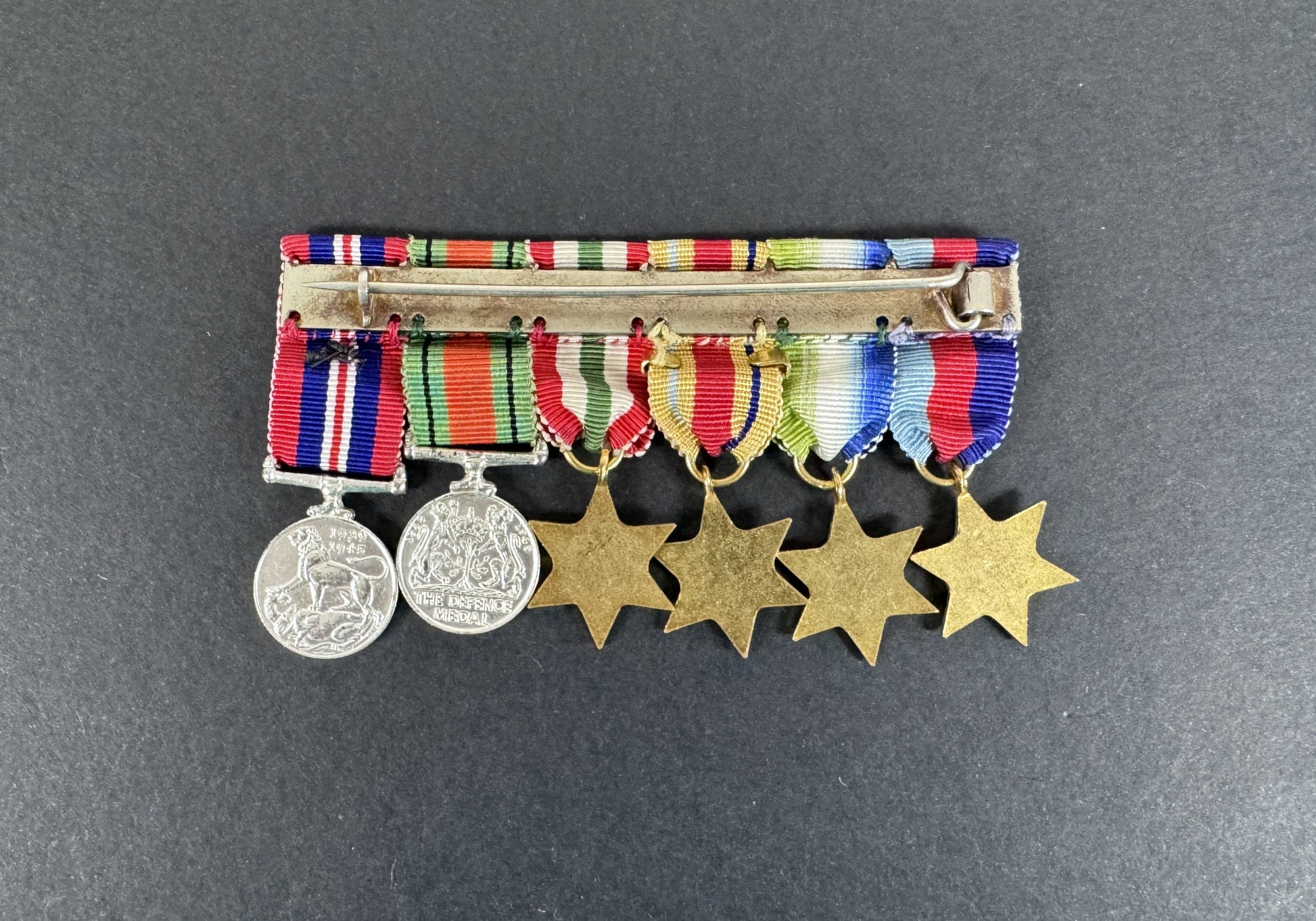Miniatura di medaglia raffigurante un veterano dell'esercito britannico della Seconda Guerra Mondiale. Composta dalla Stella d'Argento del 1939-45, dalla Stella Atlantica, dalla Stella d'Africa con fermaglio dell'8ª Armata, dalla Stella d'Italia, dalla Medaglia della Difesa e dalla Medaglia di Guerra con Foglia di Quercia al Valore del 1939-45.