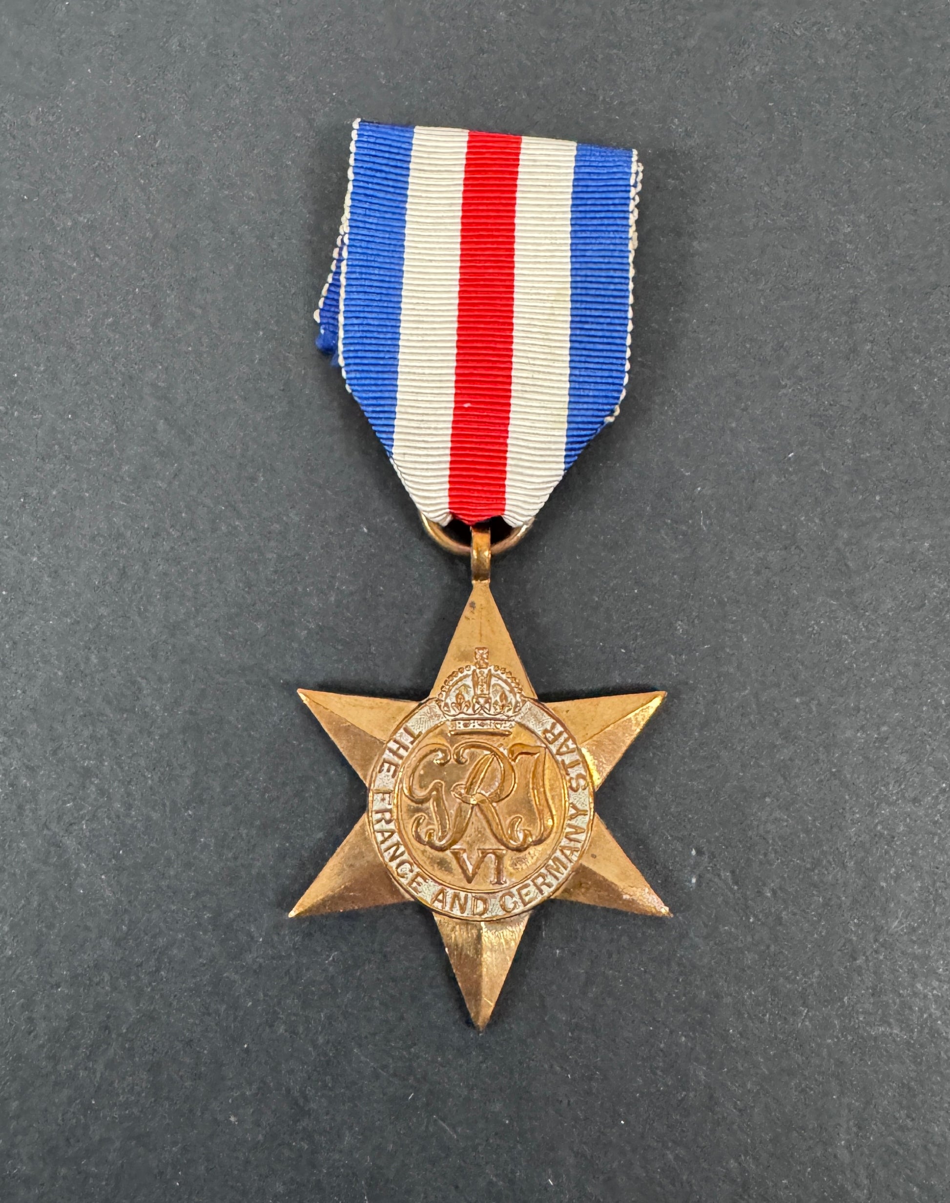 An original British issue France & Germany Star. A campaign medal awarded for combat action during the 1944 and 1945 campaign against the German forces on the Western Front (Normandy - Ardennes - Germany).