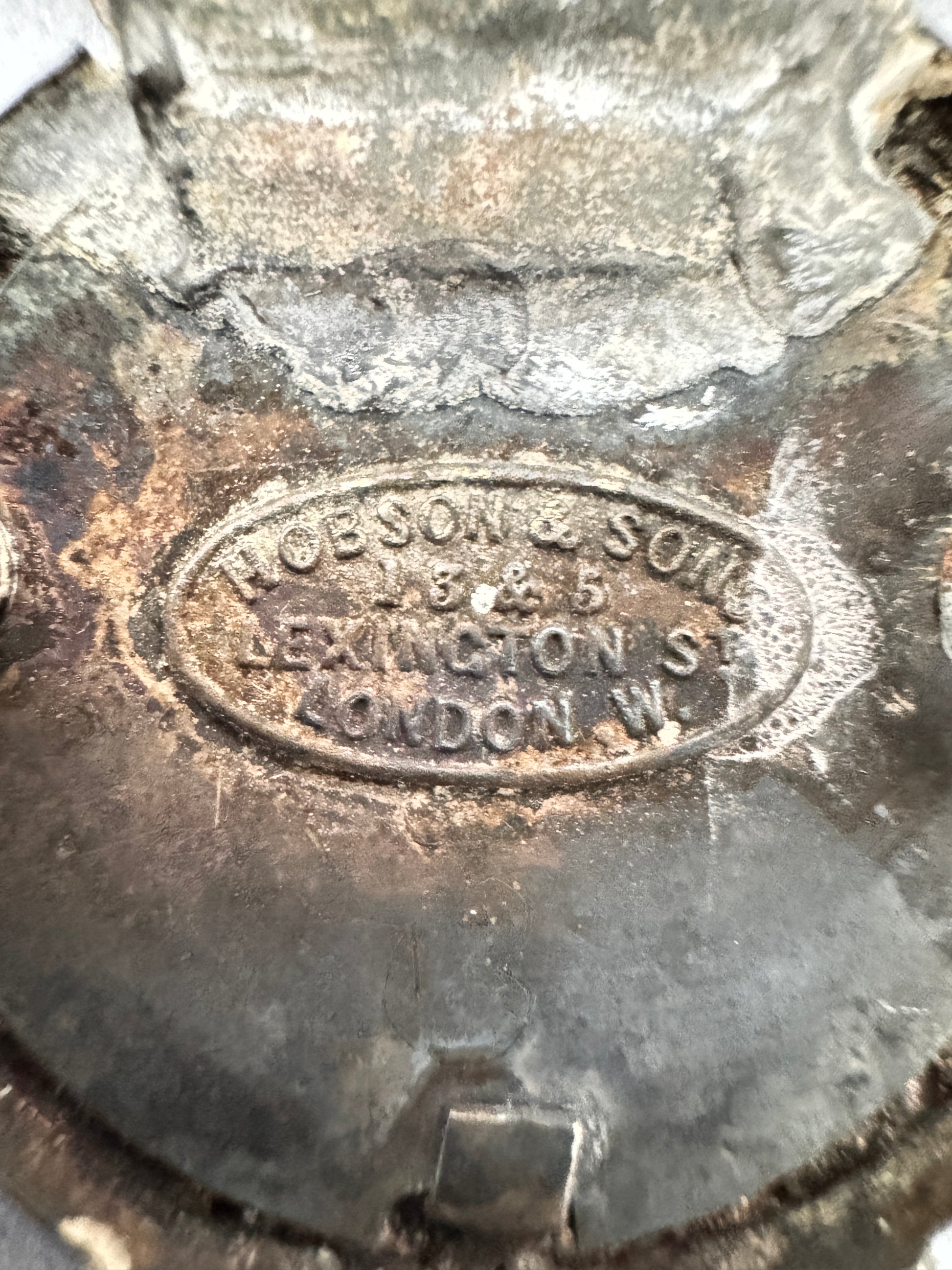 An officer's belt plate. 66 x 95 mm. White metal, not hallmarked but maybe silver or silver plated. 3 threaded post mounts, maker plate HOBSON & SONS. Very good condition.