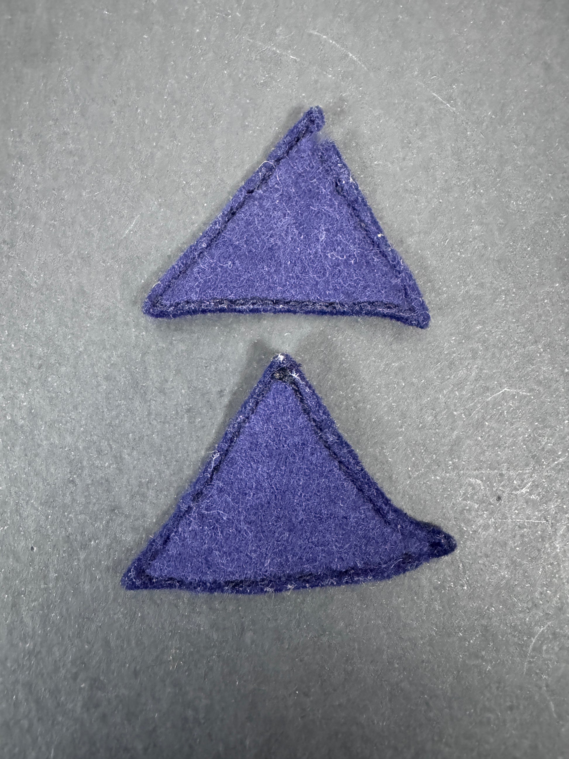 Triangular cut from blue wool felt. Approx. 45 x 45 x 50 mm. Uniform removed examples. One with a small tear. Very good condition. Circa 1946.