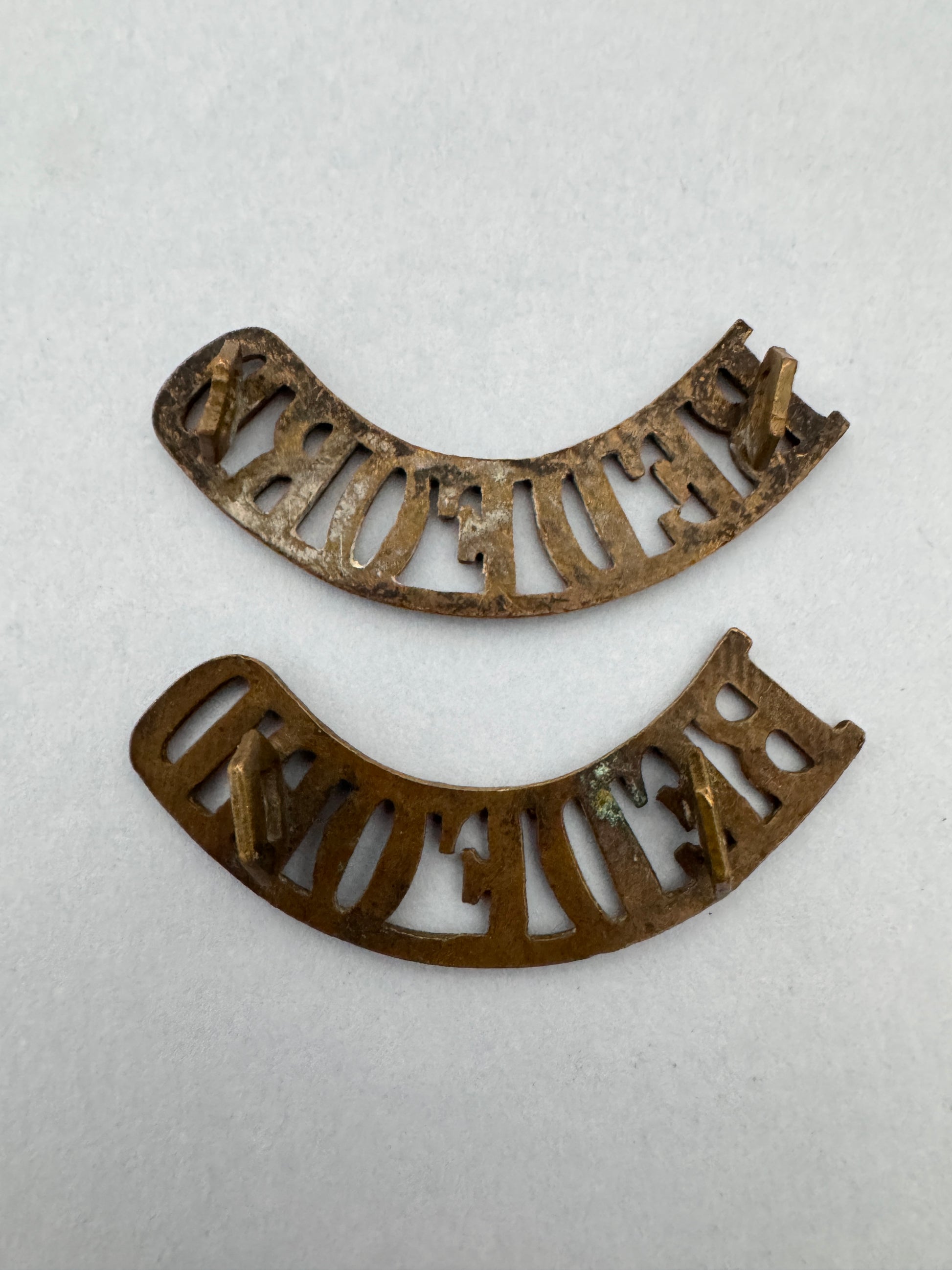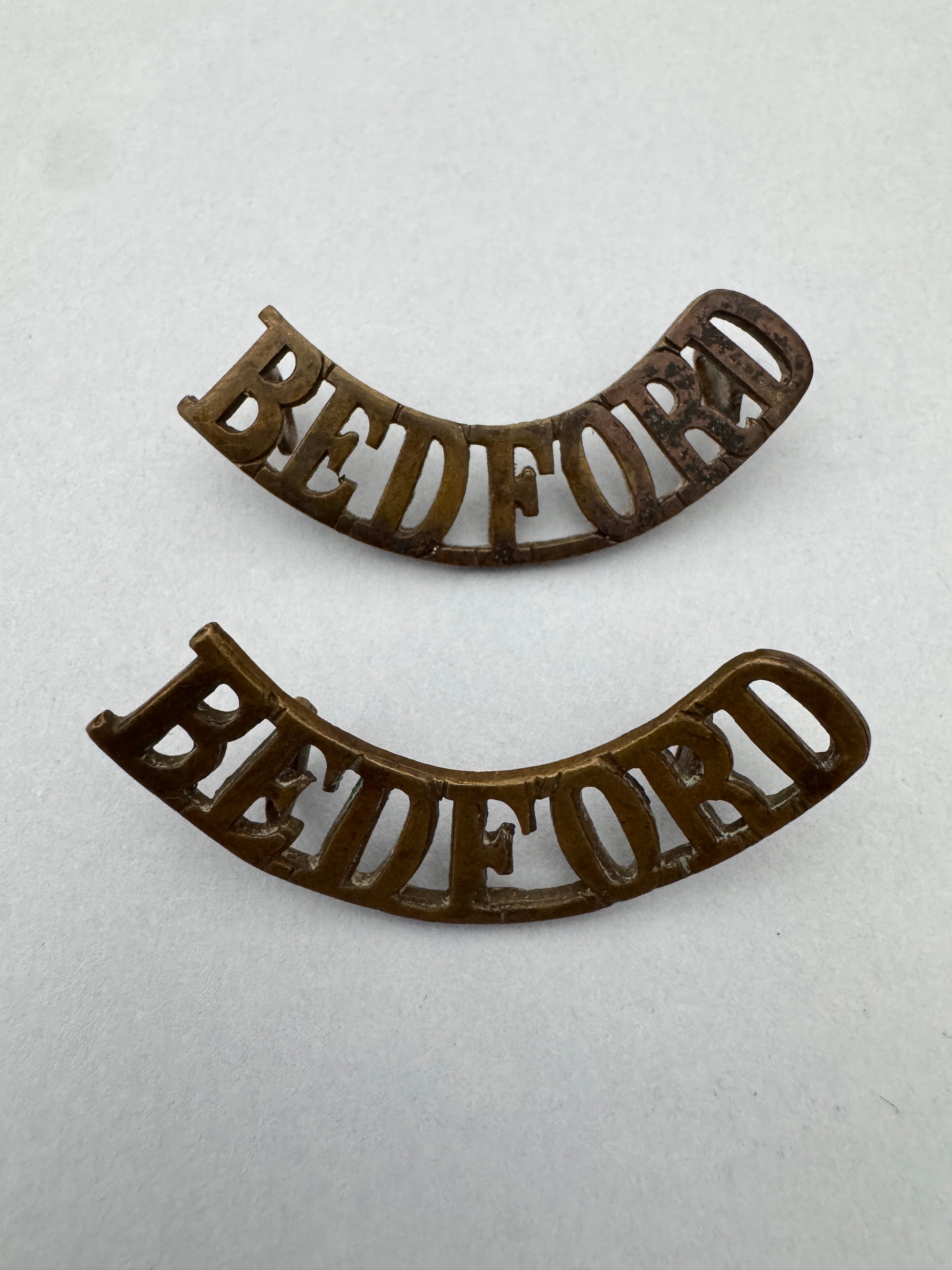 An original pair of shoulder titles of The Bedfordshire & Hertfordshire Regiment. Worn until around the end of World War One.