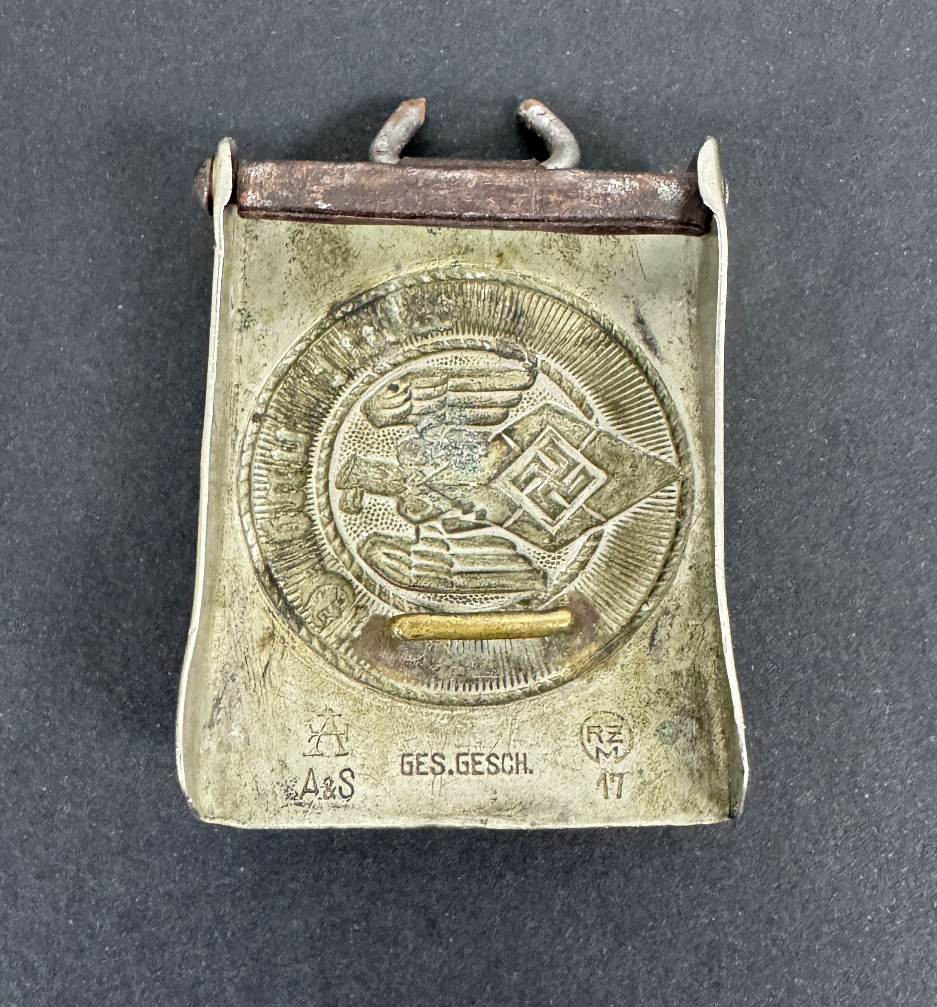 Steel rotating belt buckle, brass clasp. Maker marked A&S (Assmann), RZM 17.