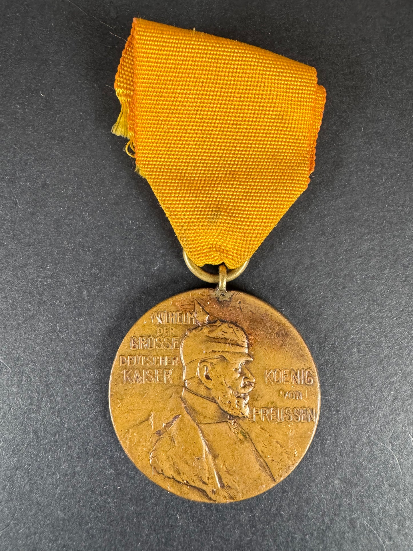 A full size 1897 Prussian Kaiser Wilhelm Centennial Medal. 40 mm bronze with correct ribbon. Gilded surface finish loss, patina to bronze, light edge contact marks.