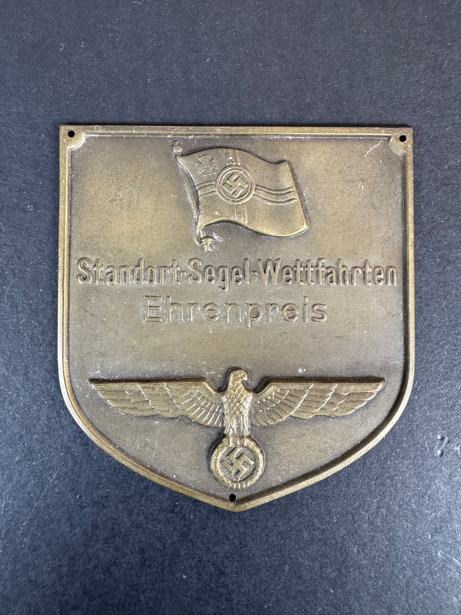 Bronze construction, 64 x 68.5 mm in size. Inscribed "Standort-Segel-Wettfahrten Ehrenpreis", featuring the Kriegsmarine battle banner and national eagle. Three mount holes. Minor surface marks. Very good condition.