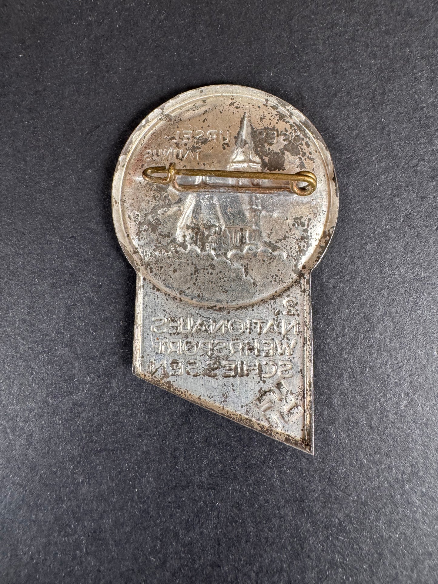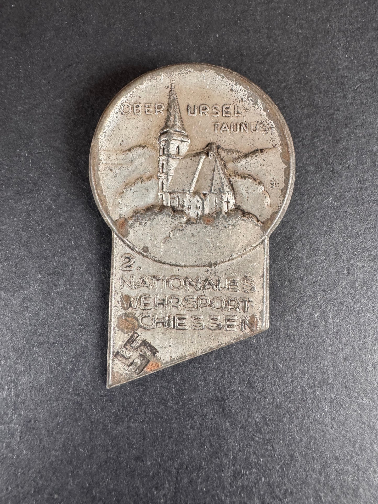 A die stamped and plated steel event badge (tinnie) of the 2nd National Military Sports Shooting event, Oberursel Taunus. 33mm x 55 mm, compete with pin. Minor plating losses.