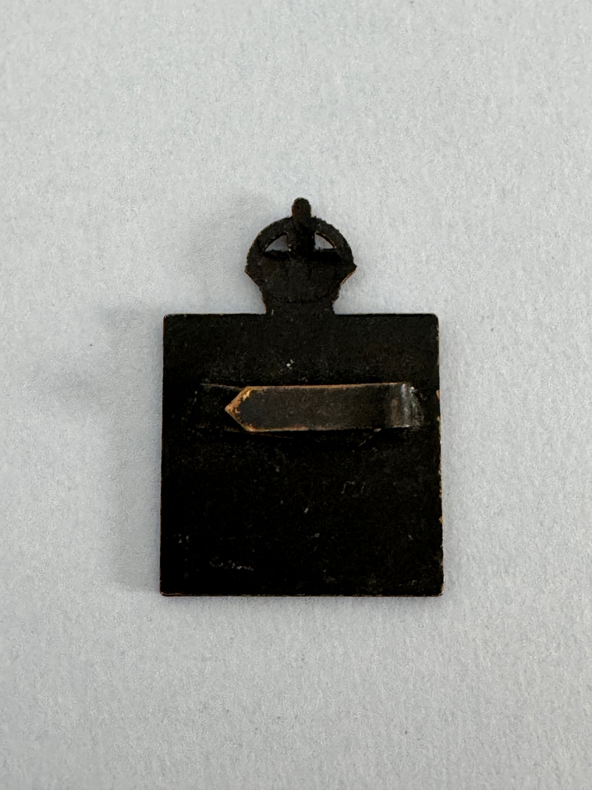 This first pattern features a minimalist square design with four stylized leaf motifs arranged in saltire (X-form), surmounted by a King's Crown. The badge is die-cast alloy with a blackened finish. Fitted with two original rear straps for attachment.