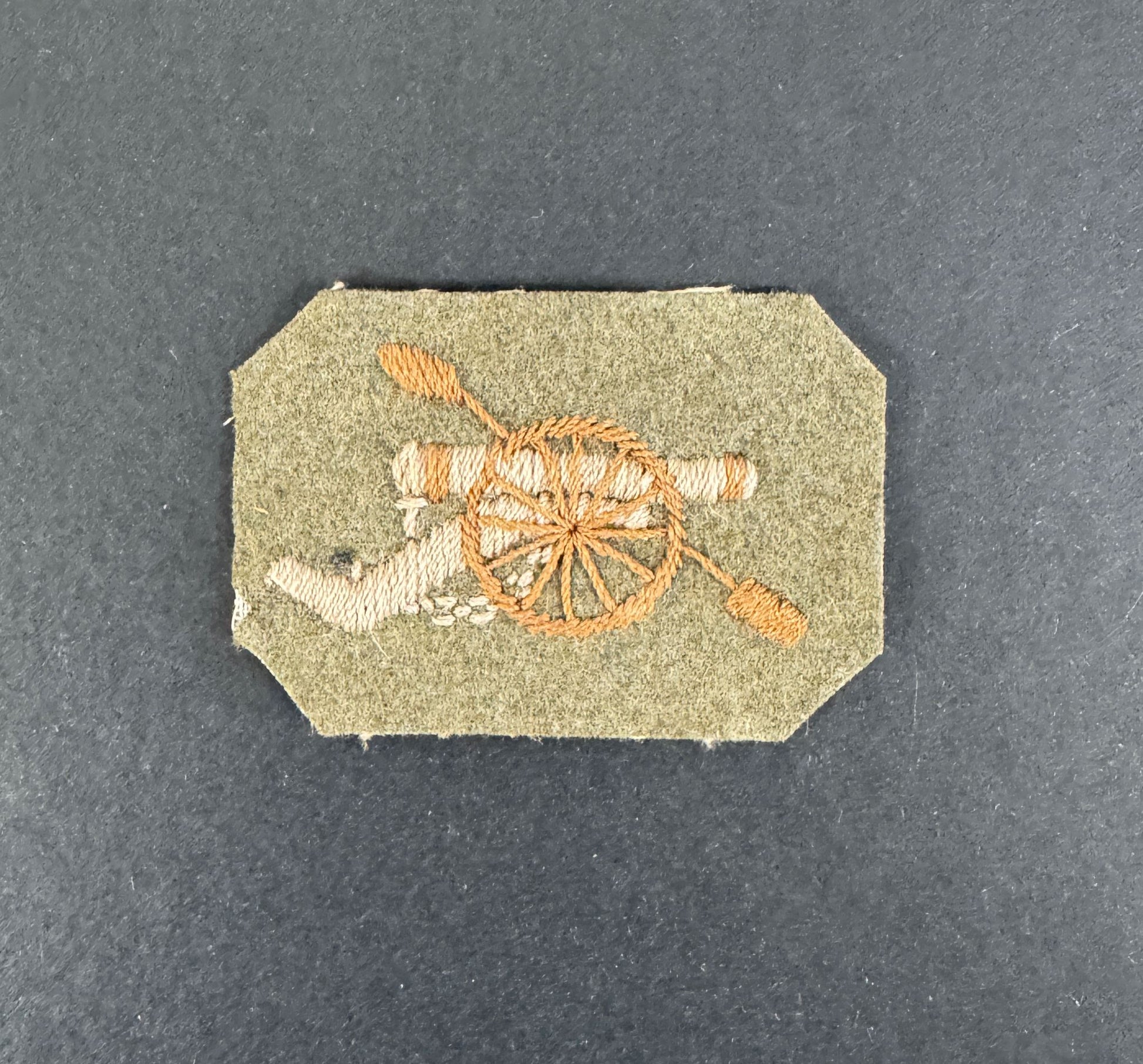 75 x 50 mm. Woven tan and sand colour on khaki wool backing. Unmounted. Very good condition. World War One or earlier pattern, rarely seen type.