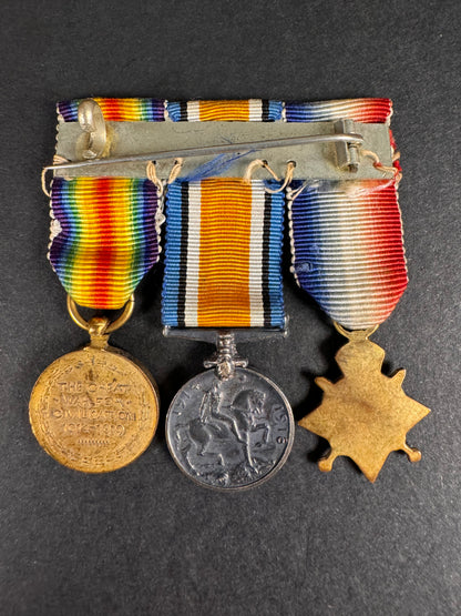 A period trio of miniature medals from the Great War mounted to bar for wear. Consisting of the 1914/15 Star, British War Medal, and Victory Medal. Fine condition.