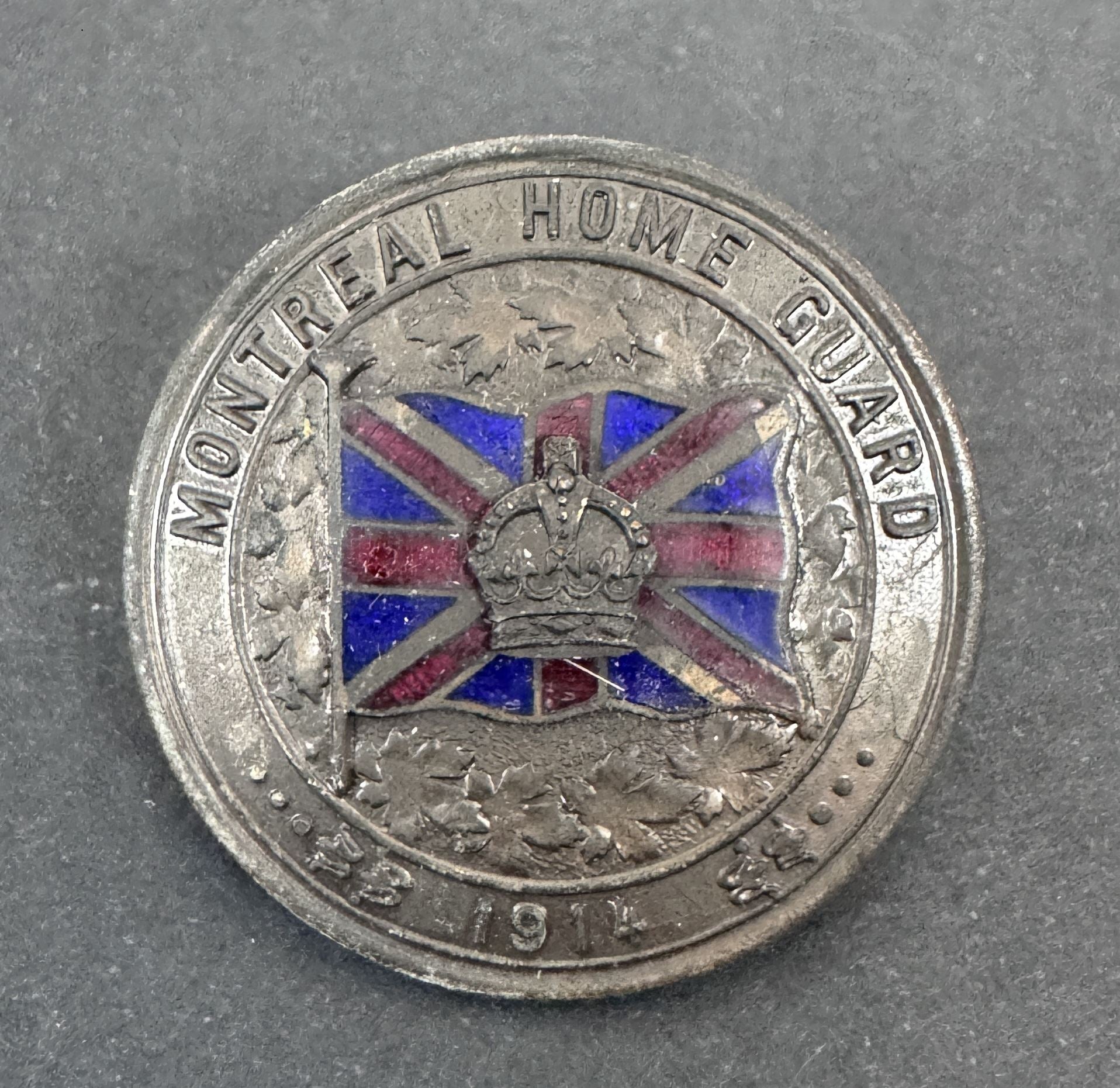 An original and extremely rare cap badge on the Montreal Home Guard.