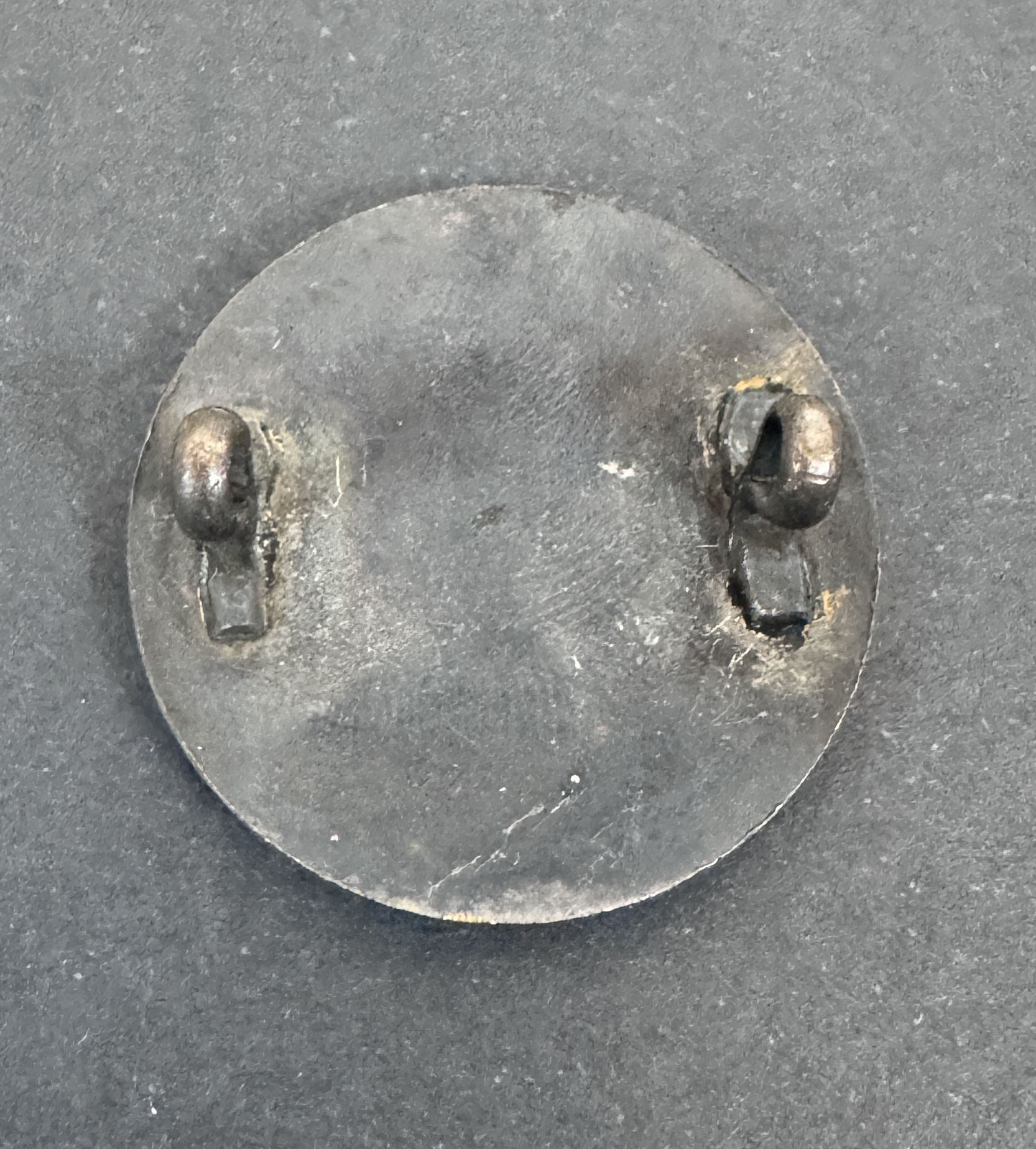 32.7 mm bronze alloy. Darkened finish. Enamel work Union Jack banner to front centre. Imperial Crown overlay. Reverse with brazed lug mounts. Light surface finish wear exposing bronze hues. Surface micro scratches to enamels and no losses.