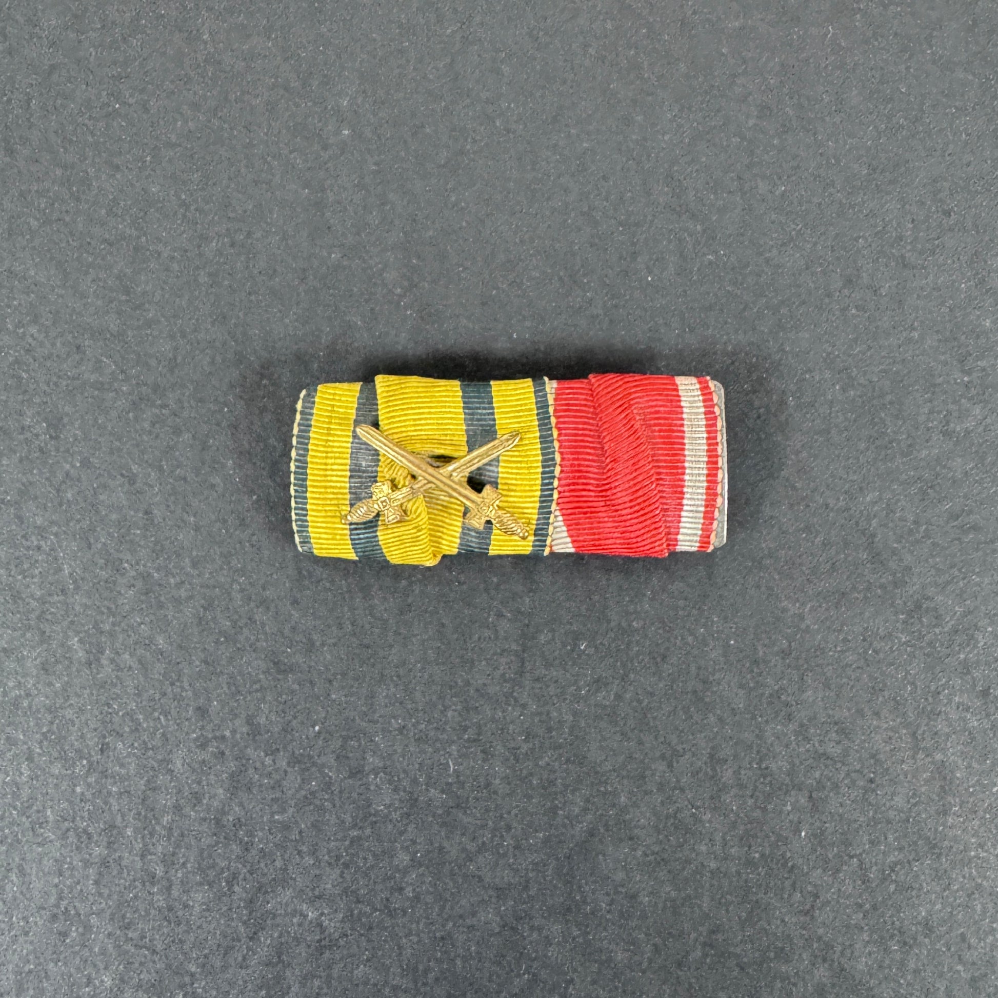 A two-award bar with the ribbons of the Württemberg Bravery Medal with Swords (for combatants), and the Württemberg Kingdom 9/15 Year Long Service Medal. Mounted to steel plate with pin. Very good condition.