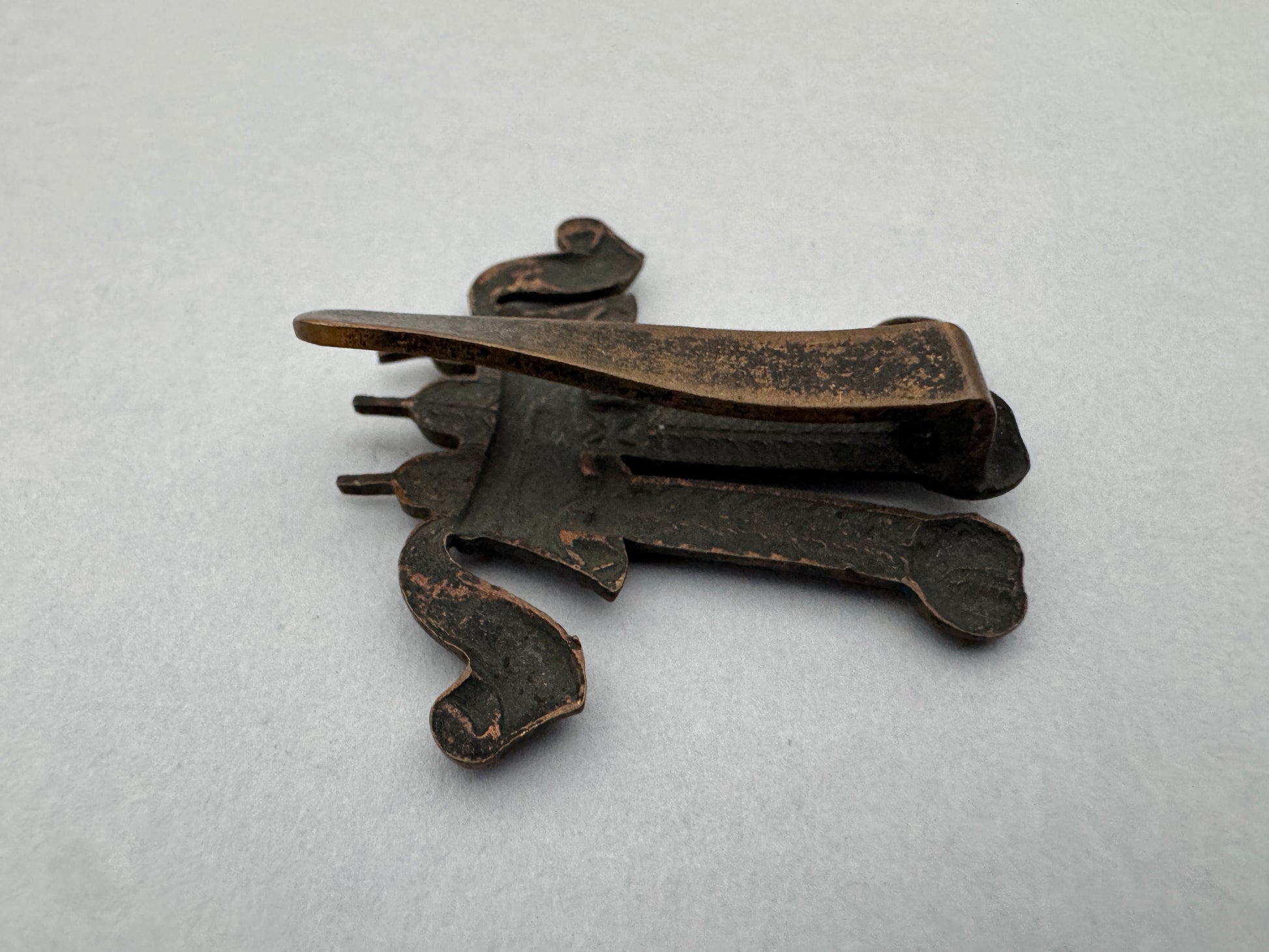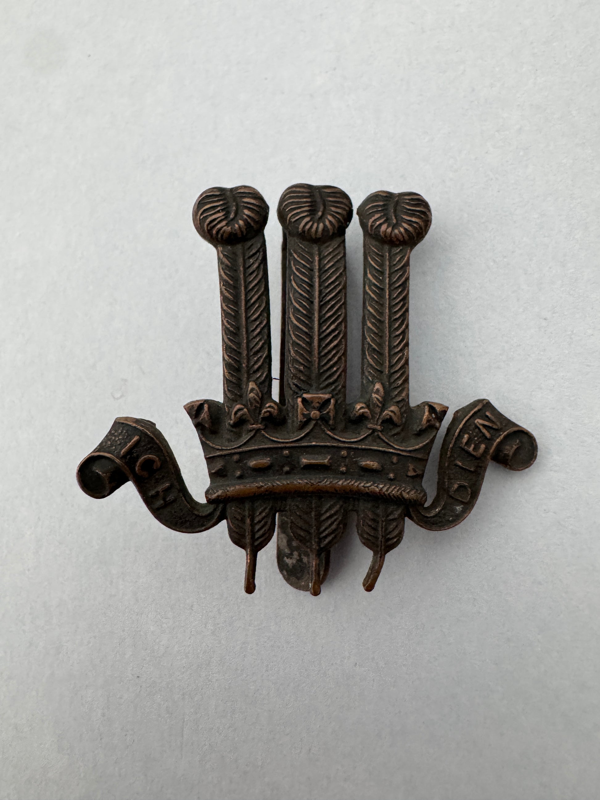 A gilding metal construction cap badge. 38 x 41.5 mm. Blackened finish. Slider mount. A feather tip bent inward and the slider twisted.