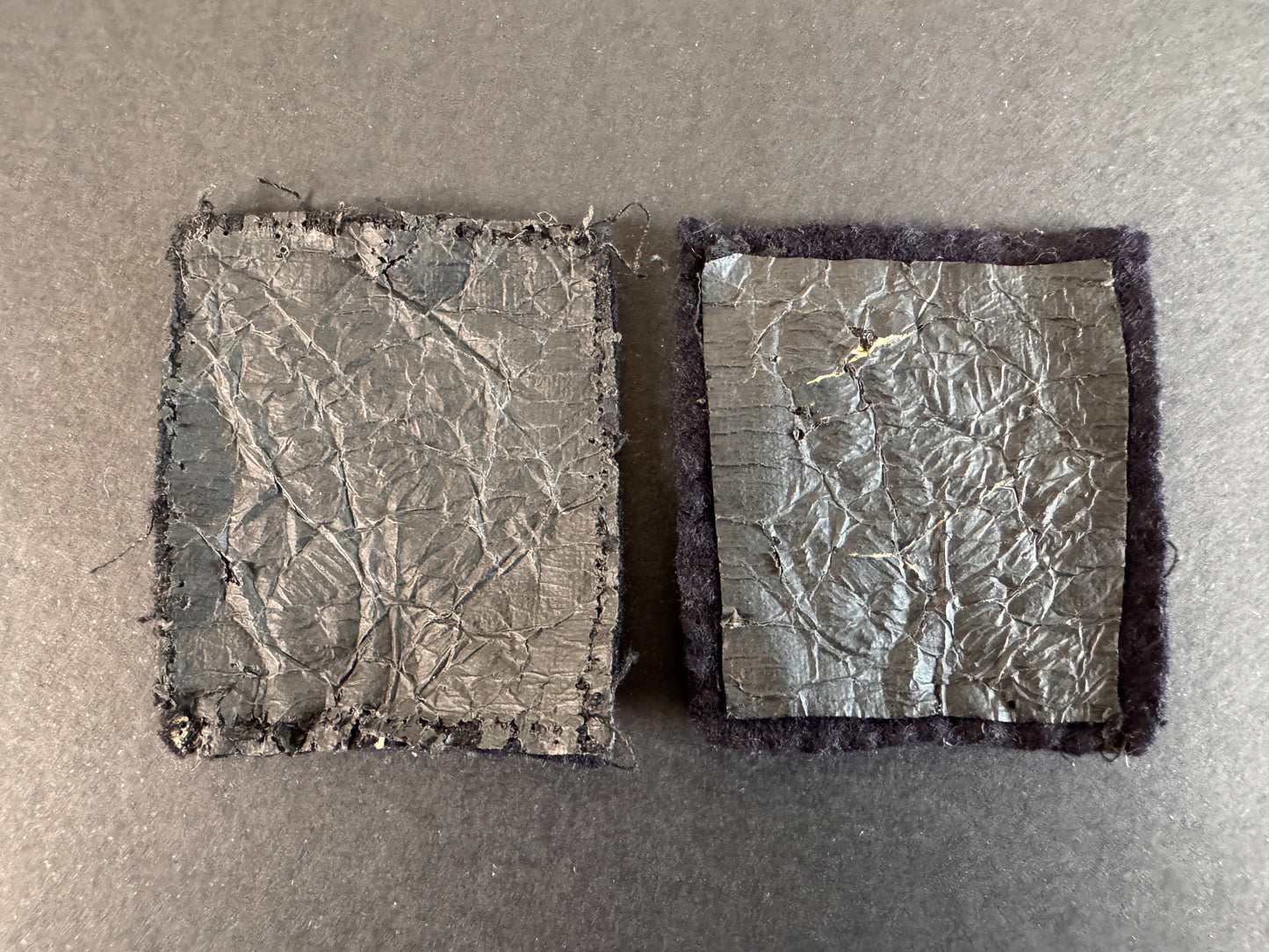 Approx. 45 x 55 mm machine woven golden thread on navy wool field, paper backings. Uniform removed in fine condition.