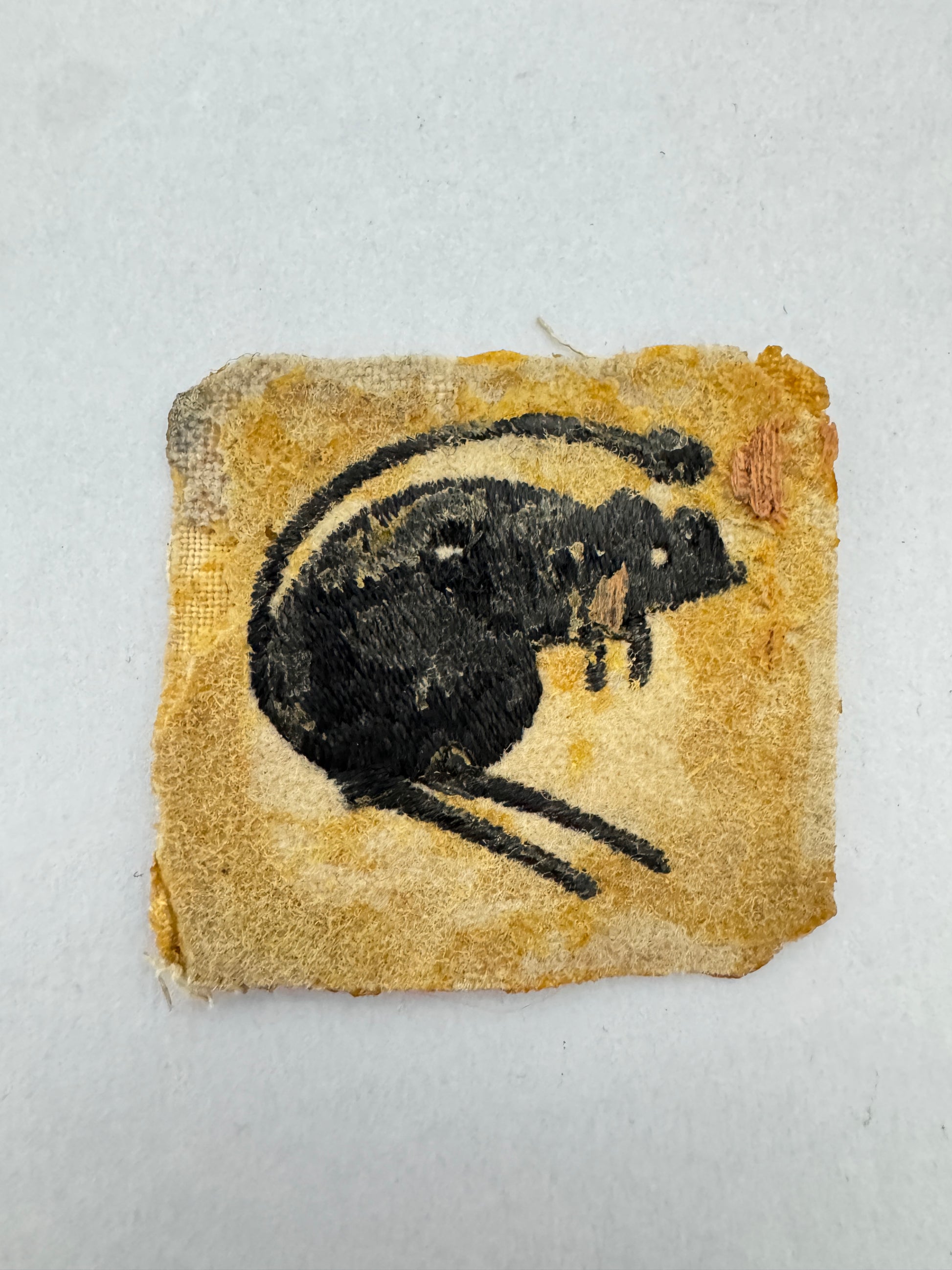 Approx. 4.5 x 4.5 cm. Woven black threaded rat on white cloth gauze badge. Removed from uniform. Stained and stiff but well preserved.