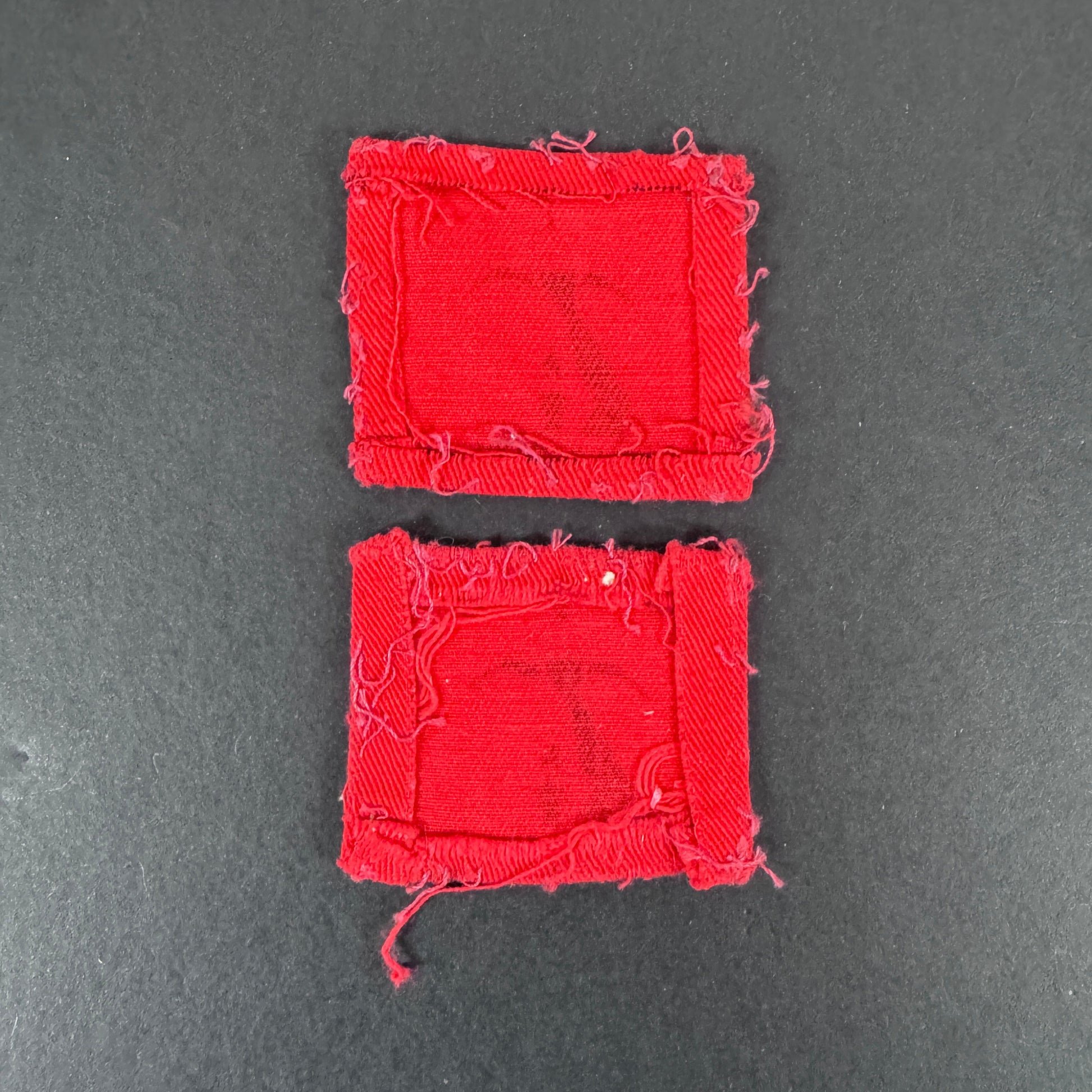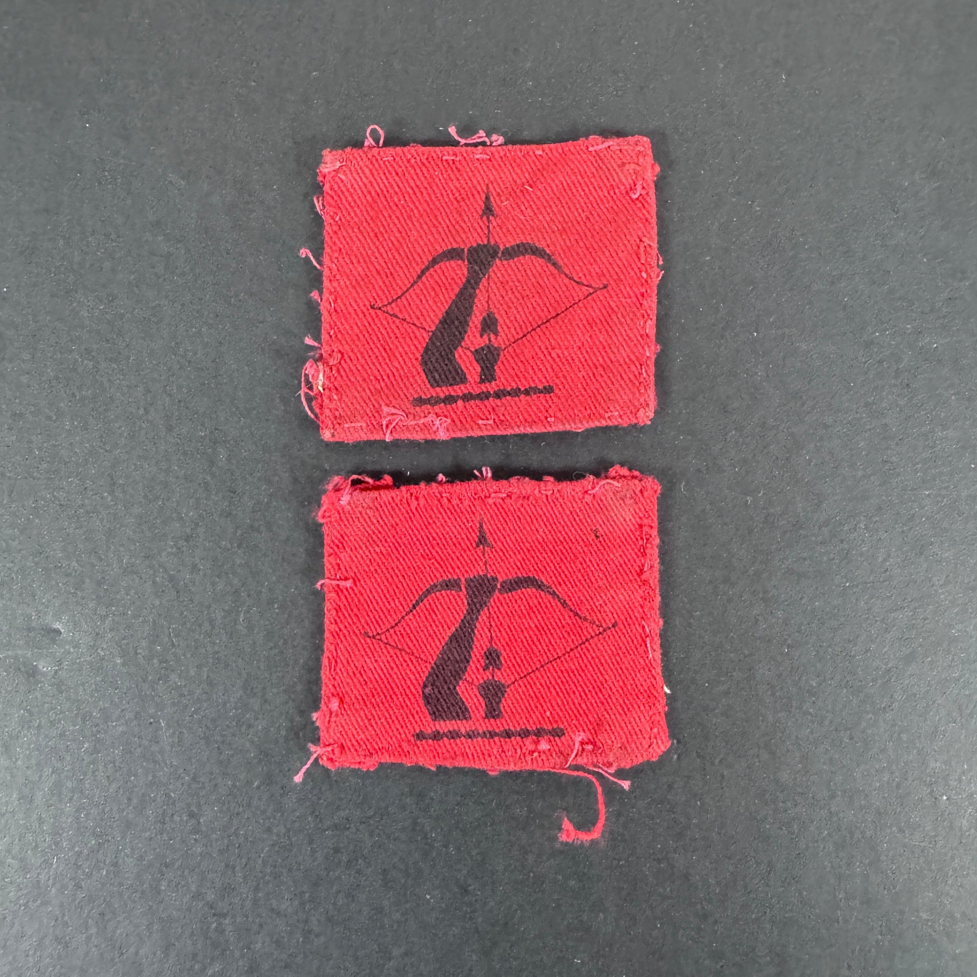 Each approximately 50 x 60 mm. Screen printed on red cotton. Unpicked from uniform. Lightly stained.