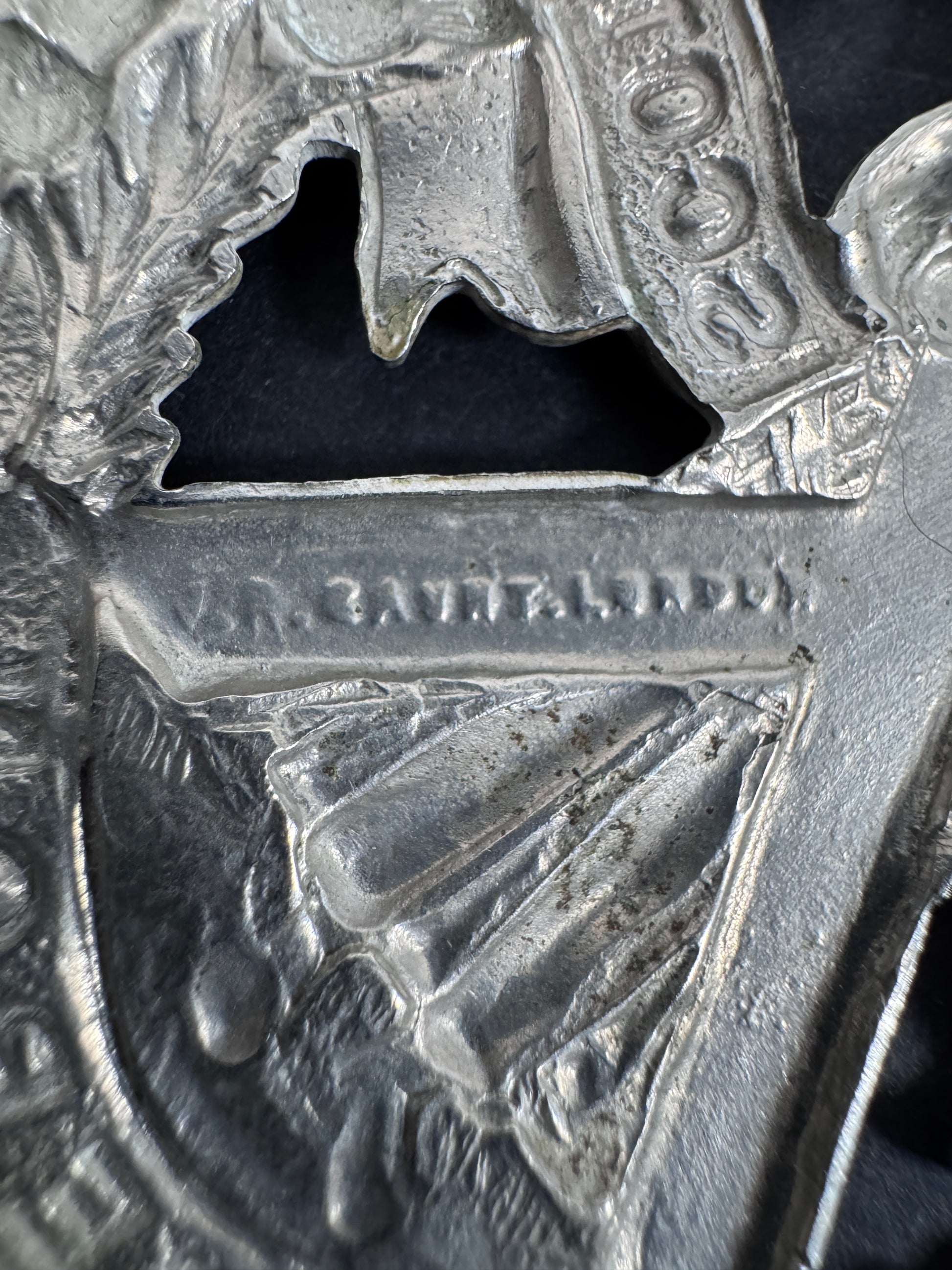 55 x 53.5 mm. White metal construction. Lug mounts. Reverse maker marked J.R. GAUNT LONDON. Very good condition.