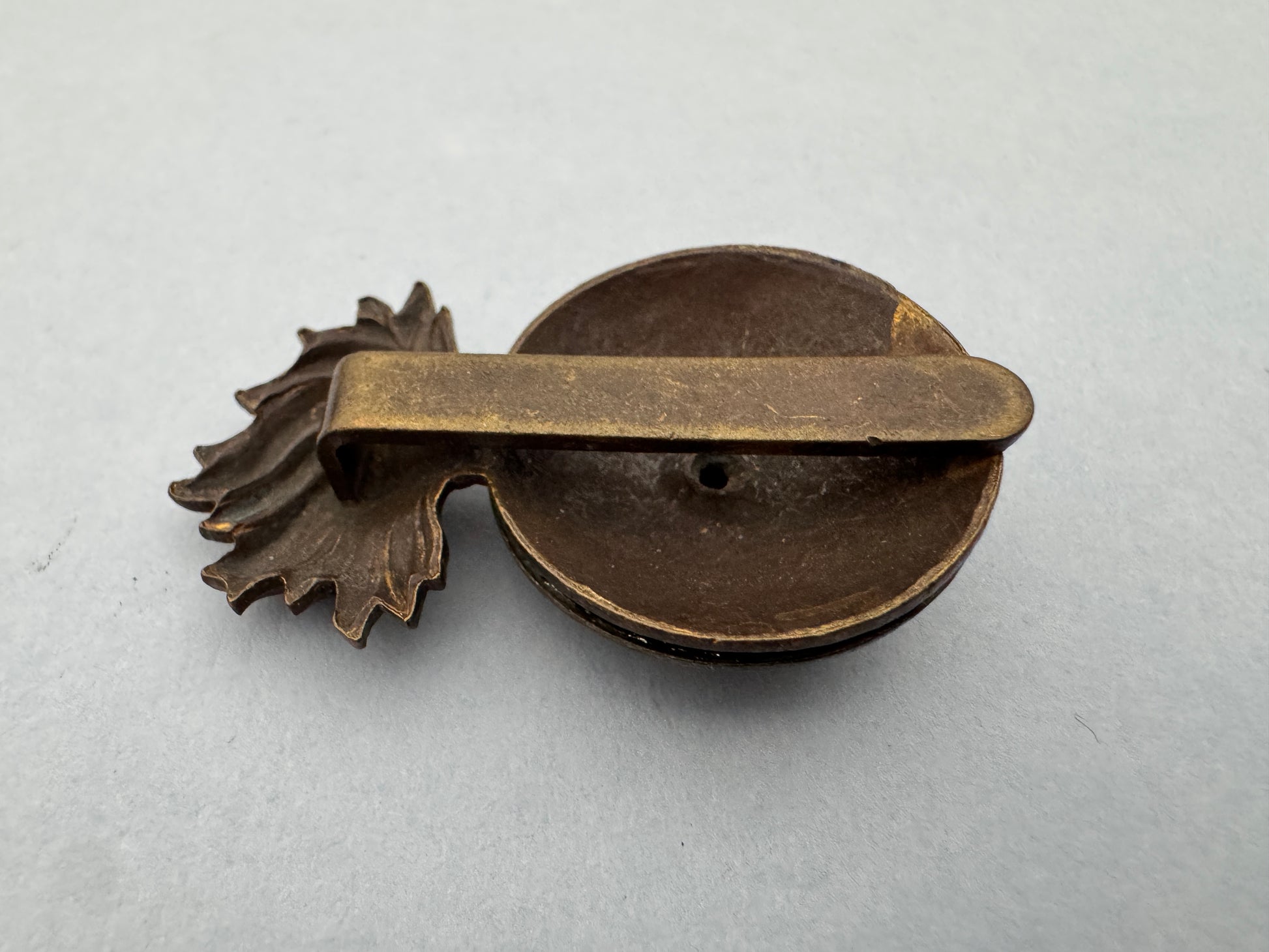 26.5 x 44.5 mm. Gilding metal and white metal construction. Slider mount affixed to the reverse. Brazing relief hole to reverse. Good age patina. Very good condition.