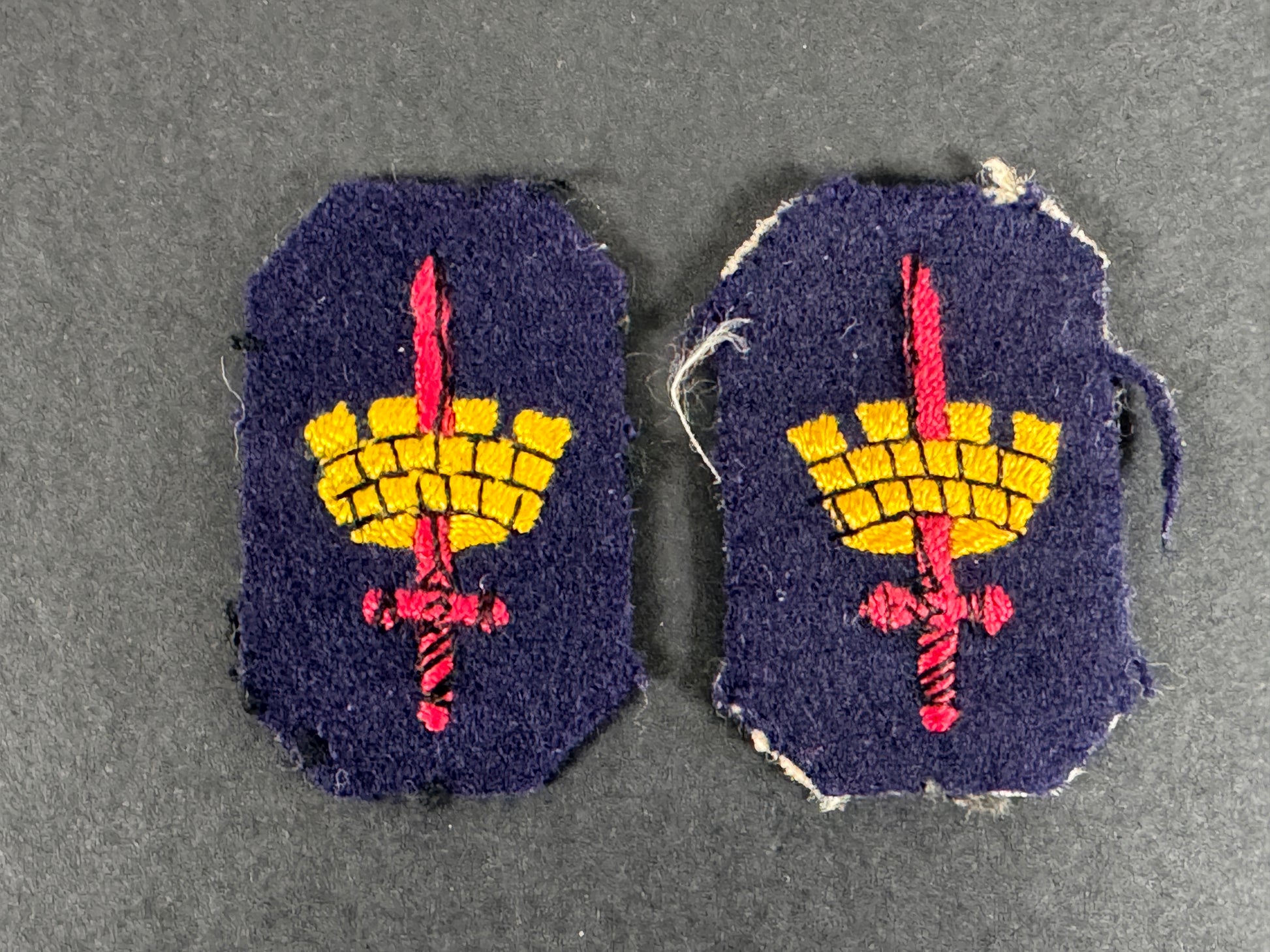 Machine woven thread on navy blue wool field. Each 30 x 48 mm. Uniform removed examples in very good condition.