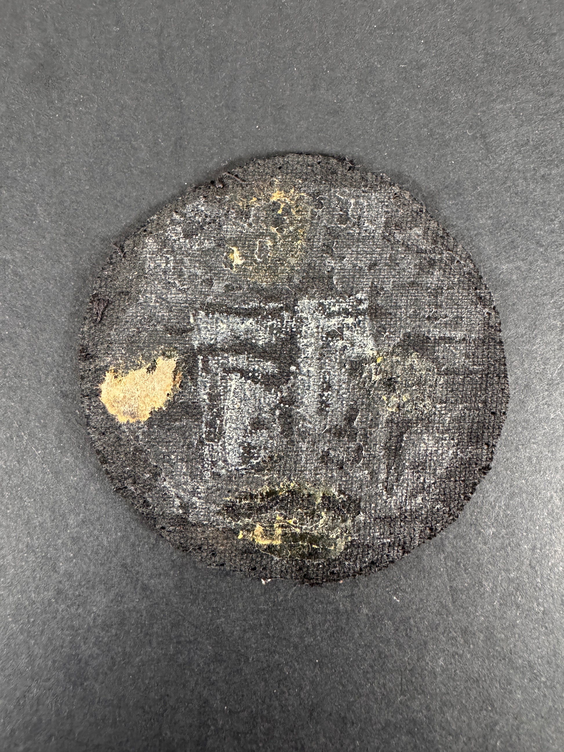 Army round cut pattern. Machine woven red thread on a dark blue wool field. 66 mm diameter. Some moth nip to the edges.