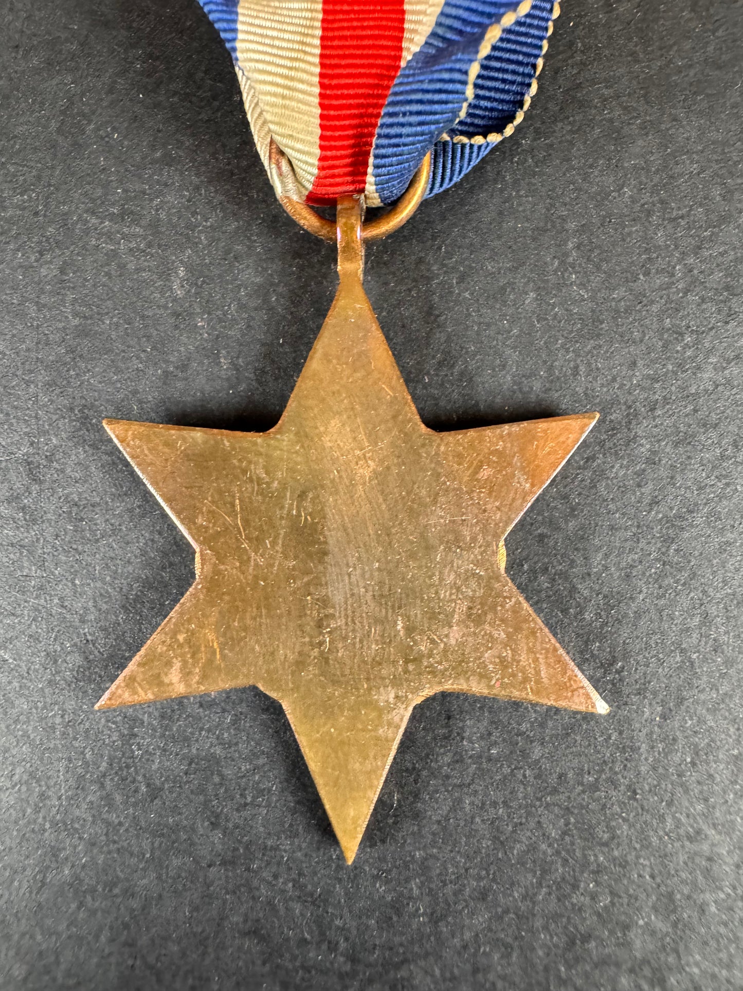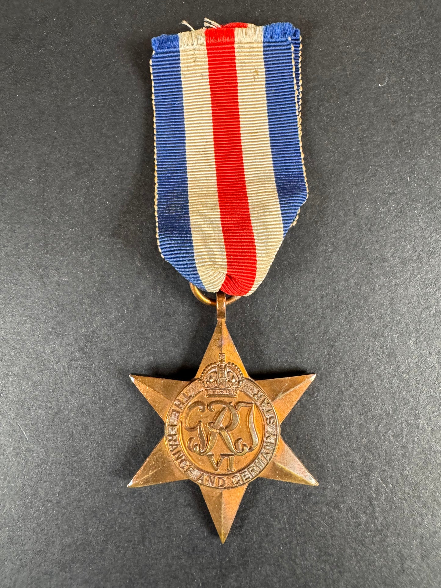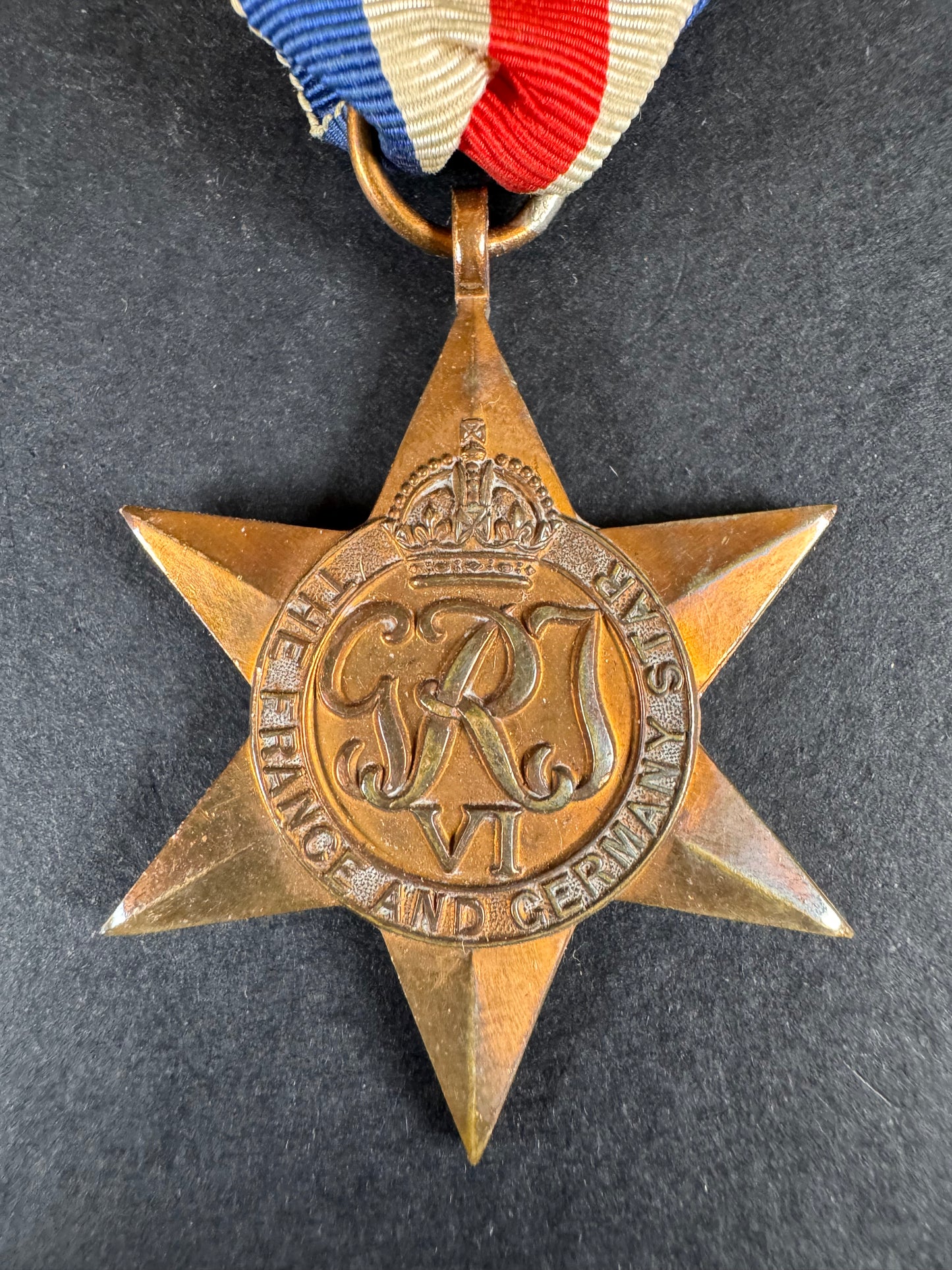 An original brass France & Germany Star medal for combat action on the 1944 campaign against the German forces on the Western Front (Normandy - Ardennes - Germany) With original ribbon. Fine condition.