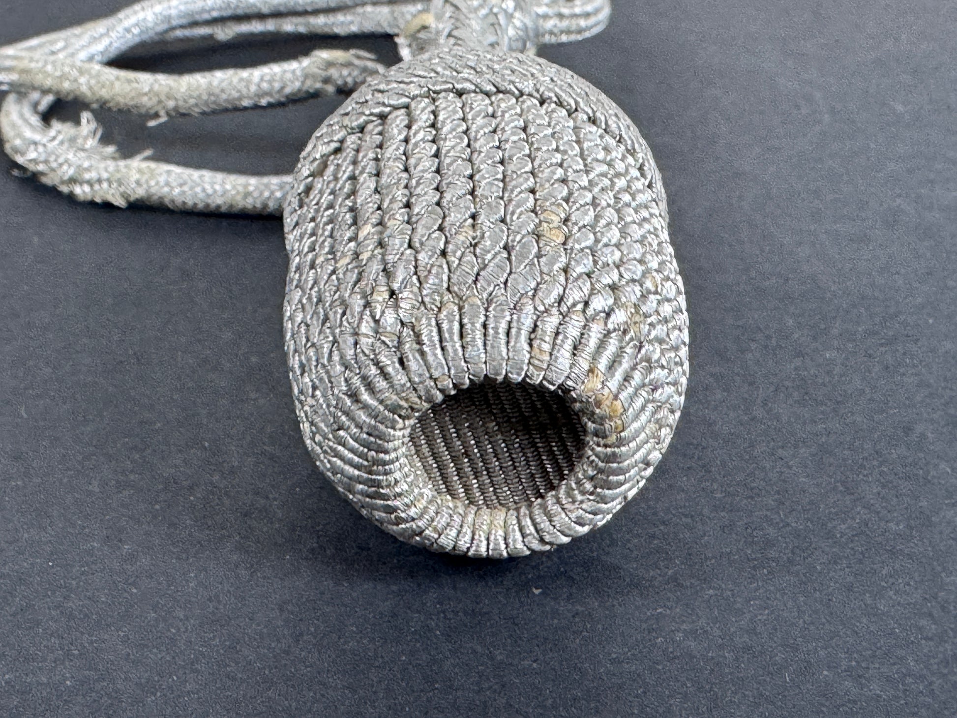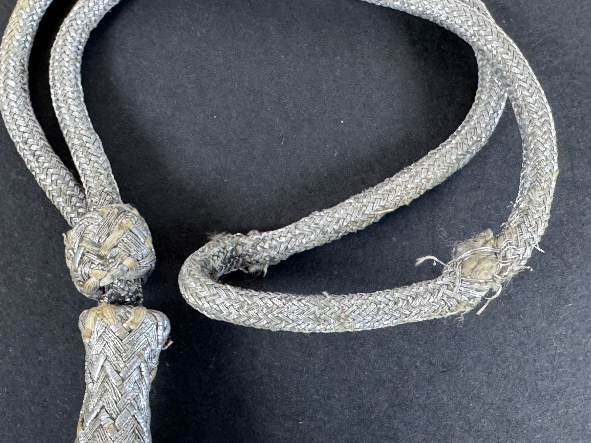 28 cm overall length, 19 cm rope length. Aluminium silver thread. A small section of frayed and split weave along the rope. Light age tones and marks, generally good condition.